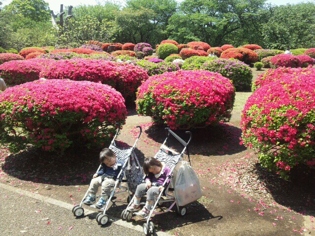 つつじをバックにグッタリ双子。