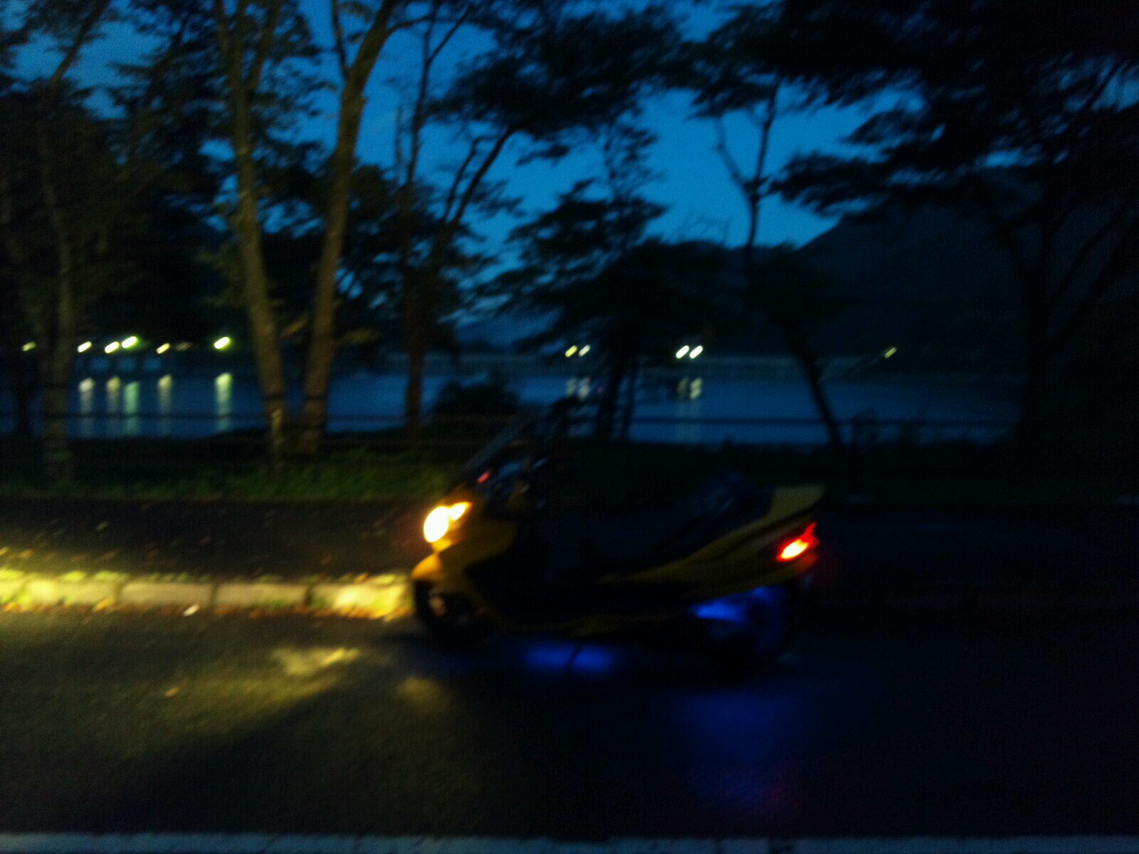 豪雨過ぎて、白線、街灯、尾灯など、