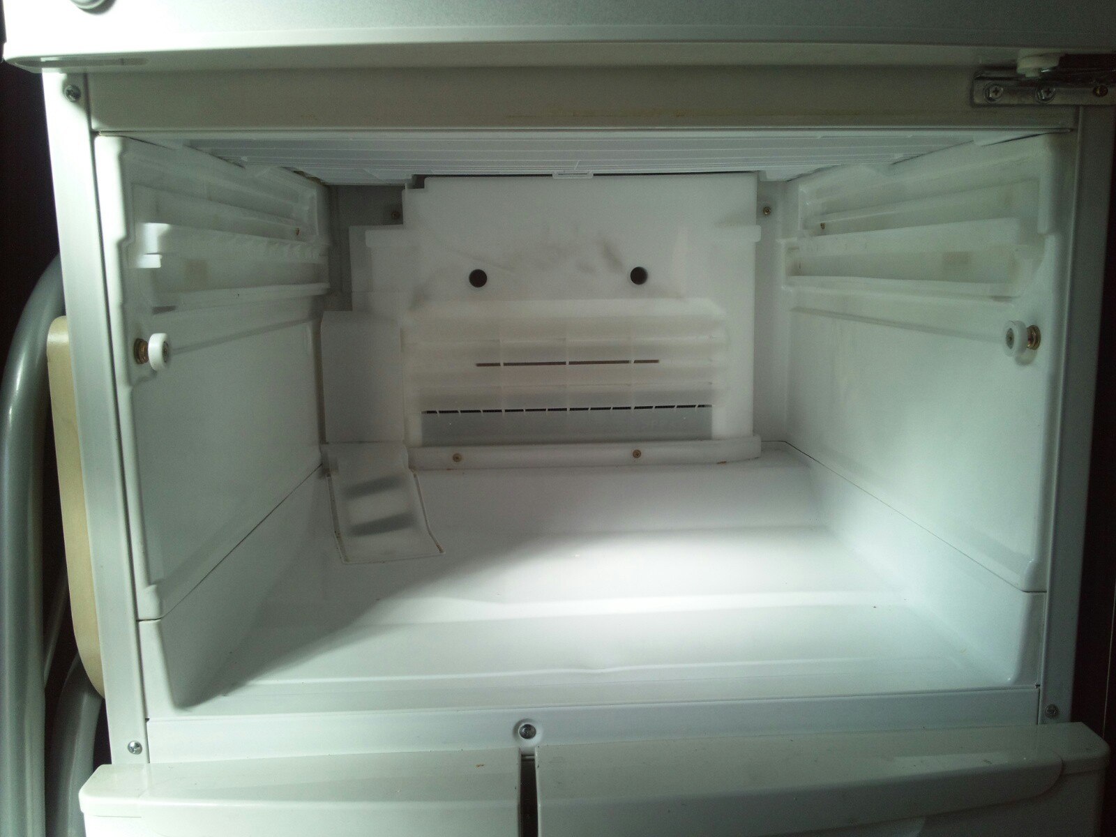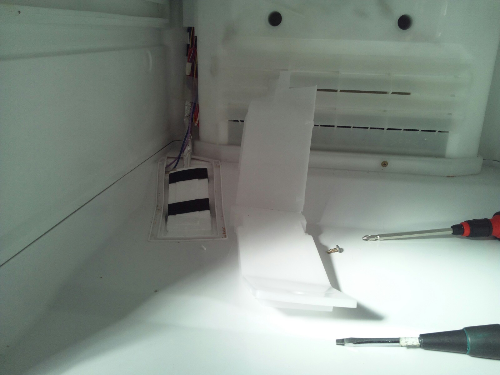 野菜室を開け、天面の内張りを外す。